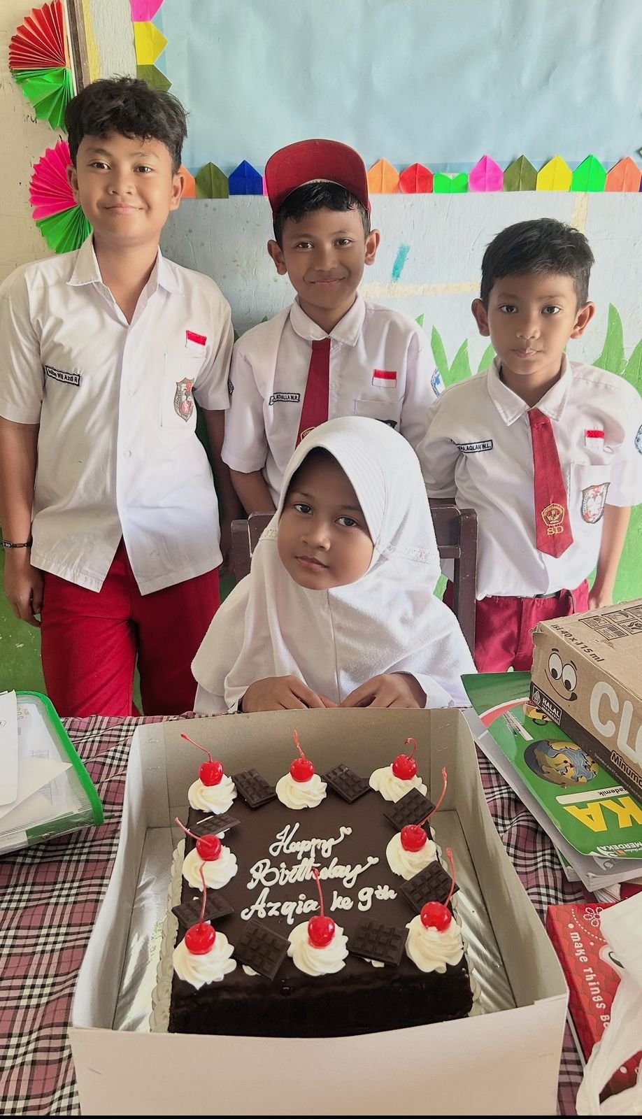 “Selamat ulang tahun Azqya, semoga sehat selalu, tambah pintar, cita-citanya tercapai, dan tetap baik sama teman-teman,” ucap salah seorang teman sekelas yang disambut riang siswa lainnya.